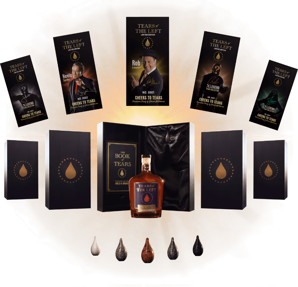 Limited Edition Box Contains: - 1 Bottle of Tears of the Left (750ml) - 1 Book of Tears - Cocktails for the Bold & Brave - 1 DEI Tear Stone** (Chilling Whiskey Stone) - 1 X Legend Signed Card for Defending Truth in a Cape